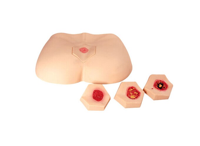 The stage bedsore nursing model can visually show the four different stages of pressure sore: stasis and ruddy stage, inflammatory infiltrating stage, shallow ulcer stage and necrotic ulcer stage. This intuitive display enables clinical nurses to more clearly understand the development process of pressure sores and deepen their understanding of the pathophysiological mechanism of pressure sores. At the same time, the model can also simulate various pathological manifestations of pressure sore, such as inflammation, ulcer, sinus, rotting flesh, necrosis, eschar, etc., which provides rich practical materials for clinical nursing teaching.
